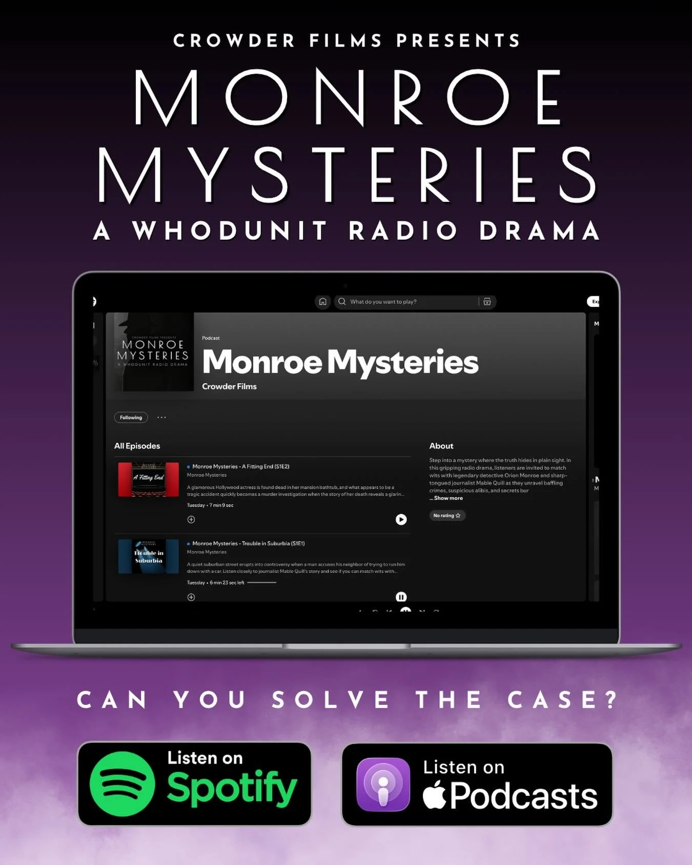 Each episode presents a new whodunit, filled with clues, twists, and red herrings. As Monroe follows the evidence and Quill digs for the story behind the story, you’ll have the chance to piece together the mystery yourself.